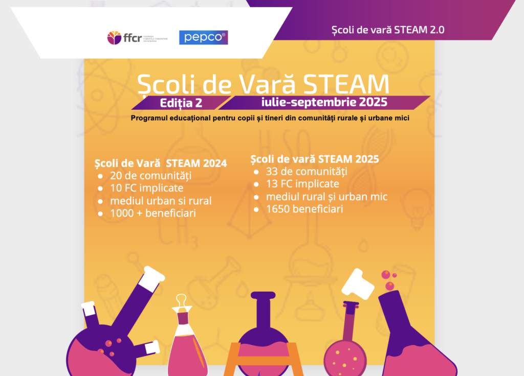 Din 2025, ne-am alăturat și noi programului Școli de vară STEAM, implementat la nivel de rețea de fundațiile comunitare din întreaga țară, iar la prima ediție am ajuns la 173 de copii din în 3 comunități, care au învățat să înțeleagă mai bine lumea din jurul lor cu ajutorul mentorilor Științescu pe care i-am mobilizat în program.